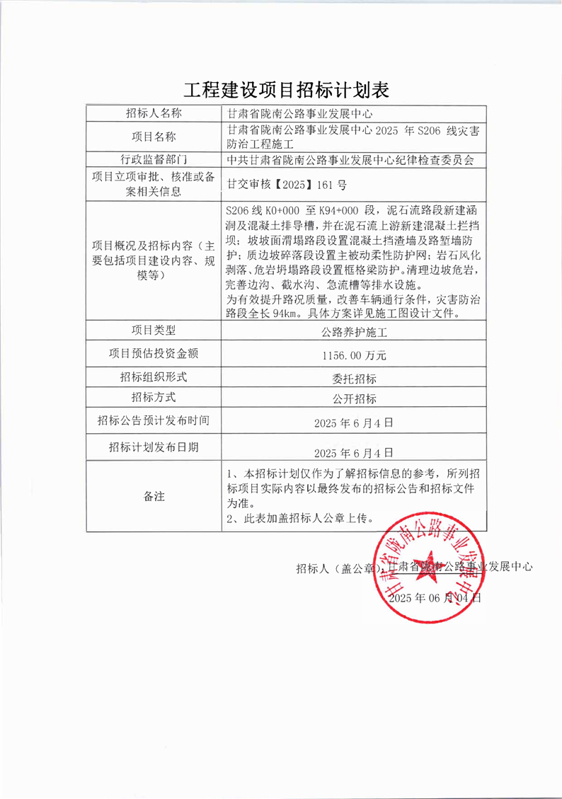 甘肅省隴南公路事業(yè)發(fā)展中心2025年S206線災害防治工程施工