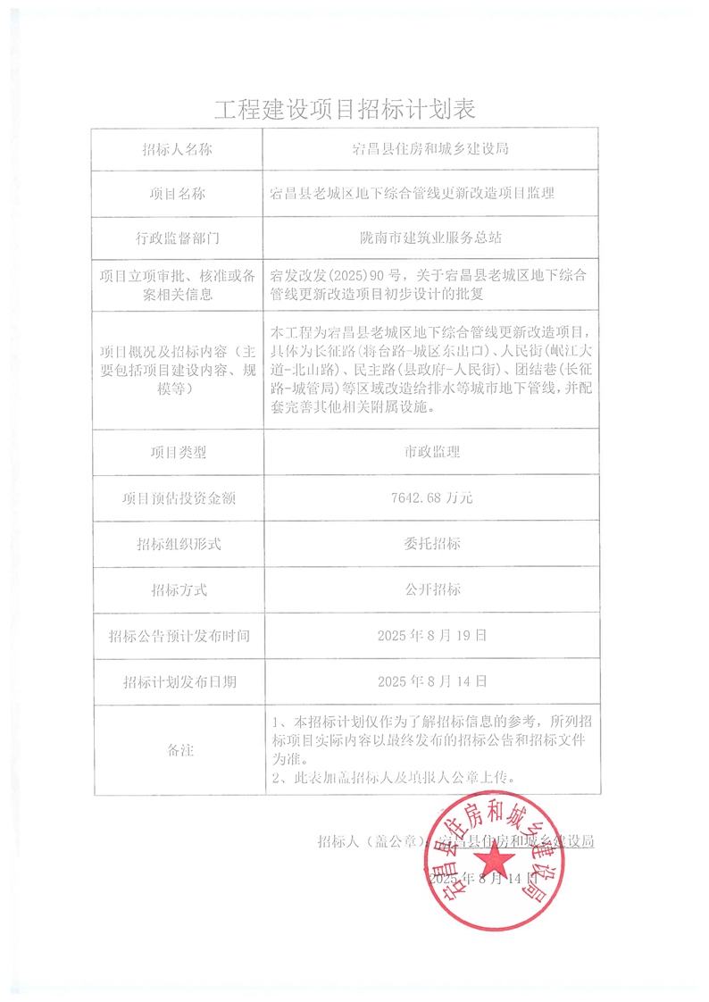 宕昌縣老城區(qū)地下綜合管線更新改造項目監(jiān)理工程招標計劃表.pdf