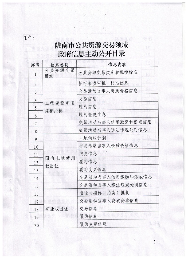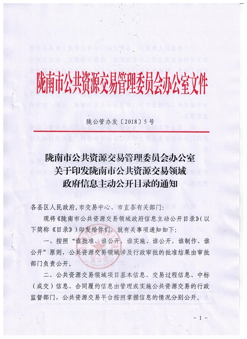隴南市公共資源交易管理委員會辦公室關(guān)于印發(fā)隴南市公共資源交易領(lǐng)域政府信息主動公開目錄的通知